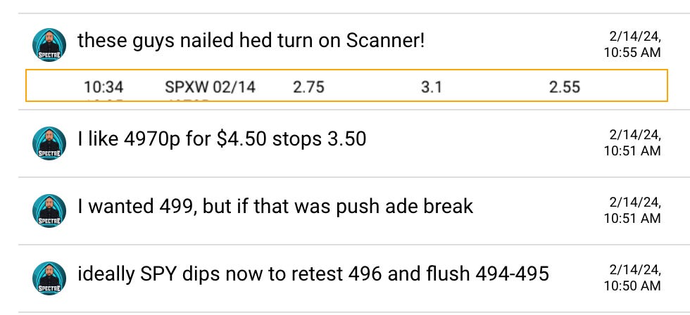 I wanted to see SPY push to 498.80 to load up short but then it rejected the peach line as you can see above and I waited to see if it breaks VWAP. As it did I alerted I like the 4970p. The problem was I was running slow. I alerted my planning about 7 minutes slower than I should have. As I entered and then started typing SPY broke. I was frustrated with myself for not sharing with members earlier.