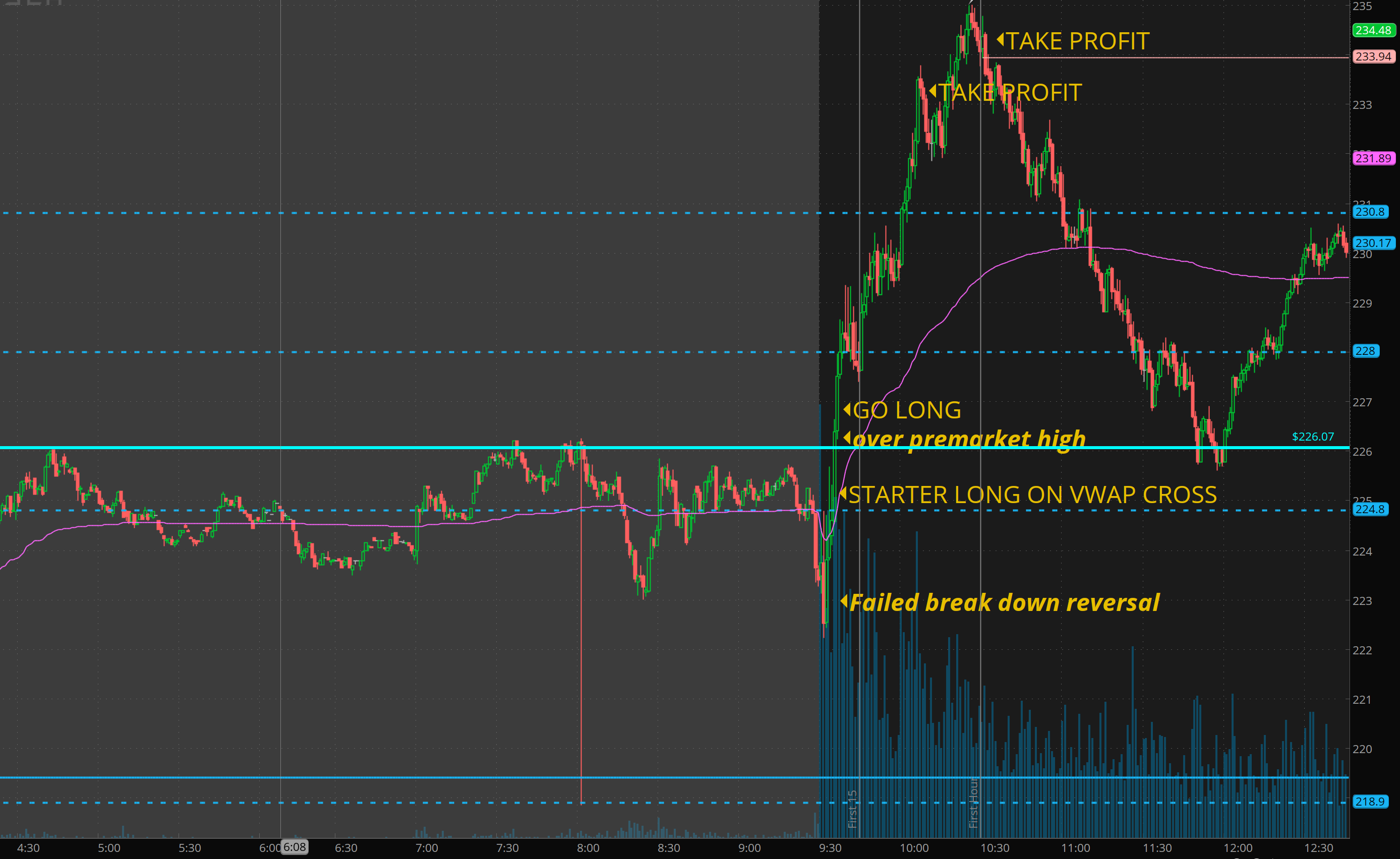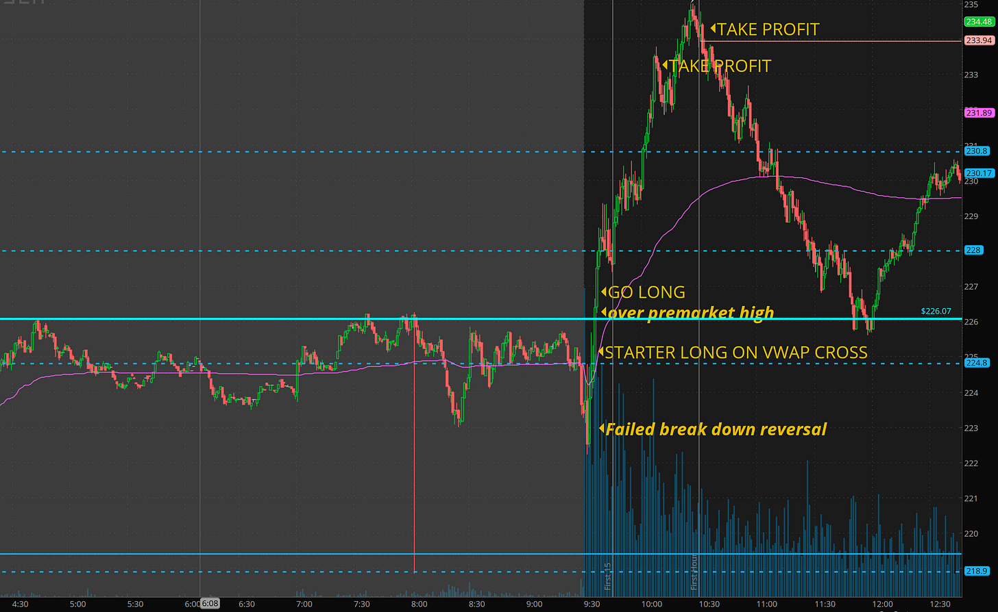 Yesterday I was ultra bullish on TSLA and I wanted a 219 dip to get long, but instead we got a dip into 223 and quick reversal back over vwap and then over 226. That is a strong trend reversal signal and though I don’t like to open trades in first 15minutes, I knew that if 230 cleared we had a shot at 235 and 245 to come so I took the trade. We ended up getting over 5R on that trade given the strong trend!