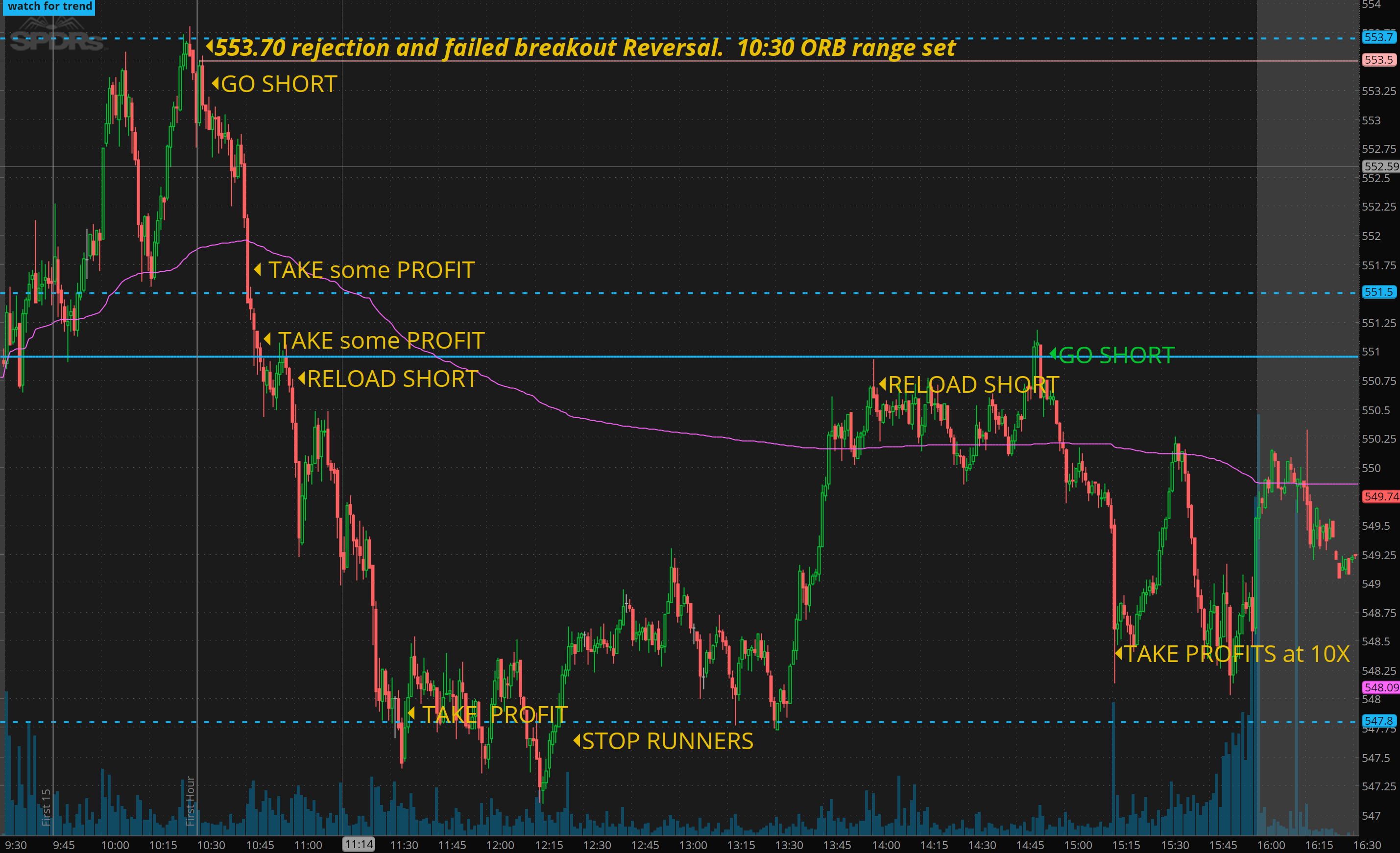 The big trade I missed was during the 2pm consolidation. I placed an order per my plan for SPX 5480p at 0.50 when it was around 1 and I took a starter at 0.80. It then popped to 1-1.20 to get me an exit on 50% and on the 0.80 entry to make it a free trade. I then fell asleep and missed the faker pop into 551 for a golden opportunity to fill at 0.25. Congrats to THT PRO member Marcos who filled at 0.25!